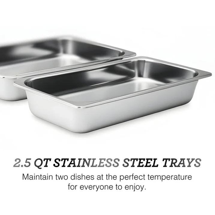 Der Wärmer wird mit zwei Behältern à 2,5 Liter geliefert, sodass Sie gleichzeitig zwei verschiedene Gerichte servieren können. Jeder Behälter verfügt über einen eigenen Deckel mit transparenter Kuppel und einer Öffnung für Besteck, was ein elegantes und praktisches Servieren garantiert.